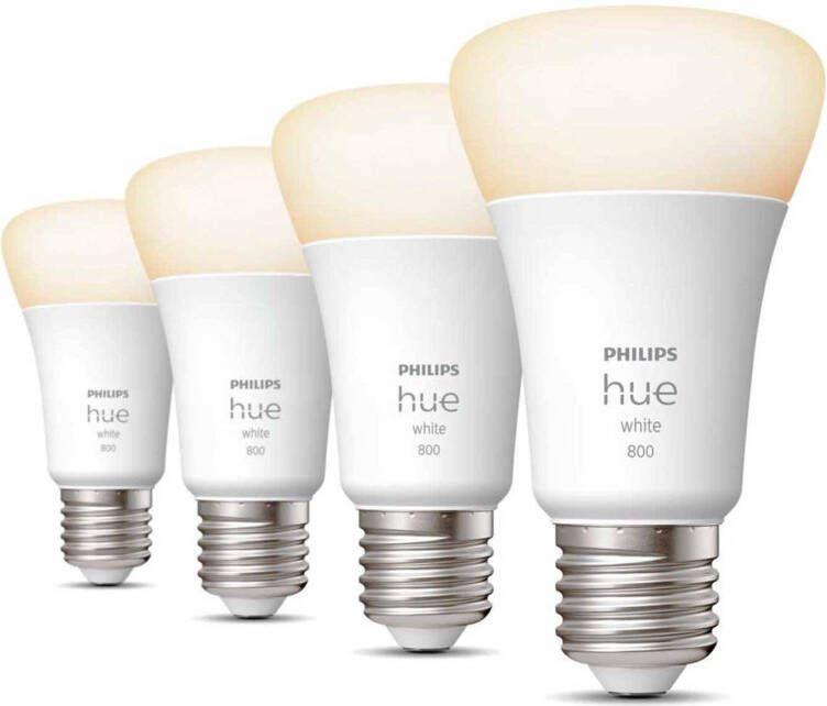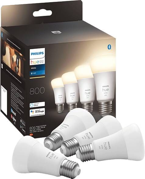 Ultieme slimme verlichting met 4-pack E27 Zachtwit licht 800 lumenGeniet overal in je huis van slimme verlichting met deze vier slimme ledlampen met E27-tting, die zacht wit licht geven.Bedien tot wel 10 lampen met de Bluetooth-appMet de Hue Bluetooth-app kun je de slimme Hue lampen in elke kamer van je huis bedienen.Bedien lampen met je stemBedien je lampen handsfree en gebruik je stem in plaats van een mobiel apparaat! Met eenvoudige spraakopdrachten kun je meerdere lampen of slechts één lamp in een kamer bedienen.Aangenaam zachtwit lichtDe helderheid van deze lampen is vergelijkbaar met een traditionele lamp van 60 W.Creëer de juiste sfeer met zacht, wit lichtHue lampen en armaturen maken gebruik van zacht wit licht.Ontgrendel alle mogelijkheden van slim licht met Hue BridgeVoeg een Hue bridge (afzonderlijk verkrijgbaar) toe aan je slimme LEDlampen en ervaar alle mogelijkheden van Philips Hue.Eigenschappen:- Bedien tot wel 10 lampen met de Bluetooth-app- Bedien lampen met je stem- Creëer de juiste sfeer met warm tot koelwit licht- Creëer de perfecte lichtrecepten voor je dagelijkse activiteiten- Ontgrendel alle mogelijkheden van slim licht met Hue bridge.